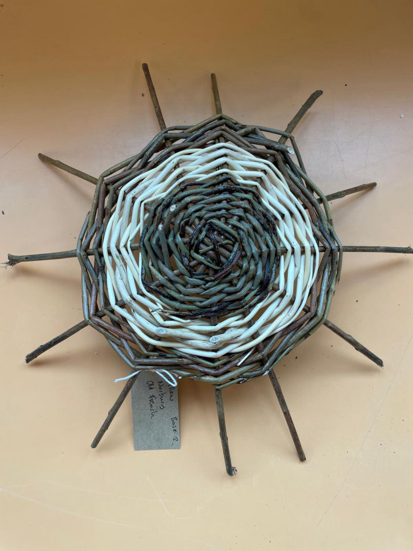 I saw a traditional basket at Acton Scott that went from pairing into a double row of three-rod waling to create a foot. I tried to replicate it with this base. However, I think that basket was made from some sort of cane.